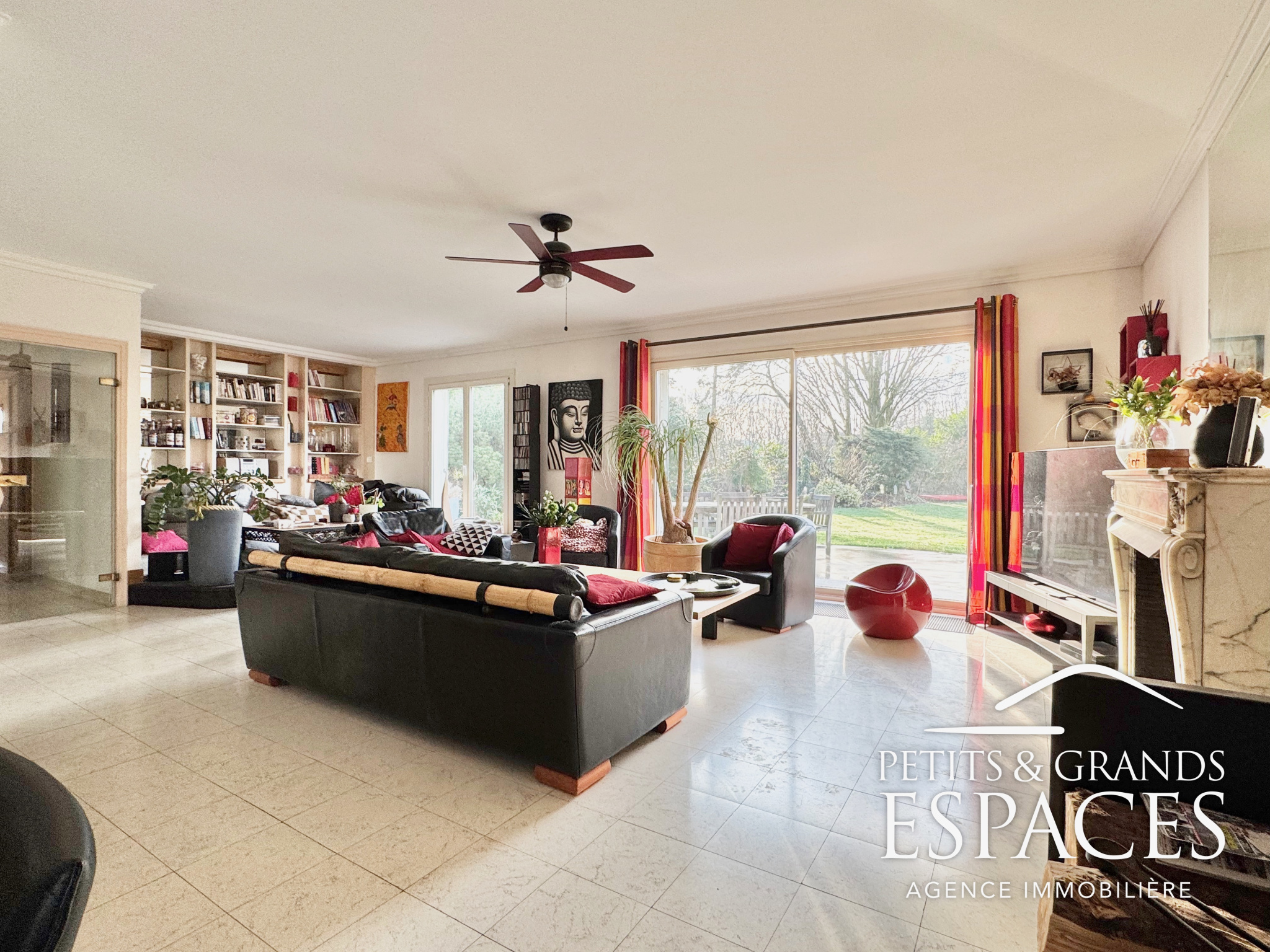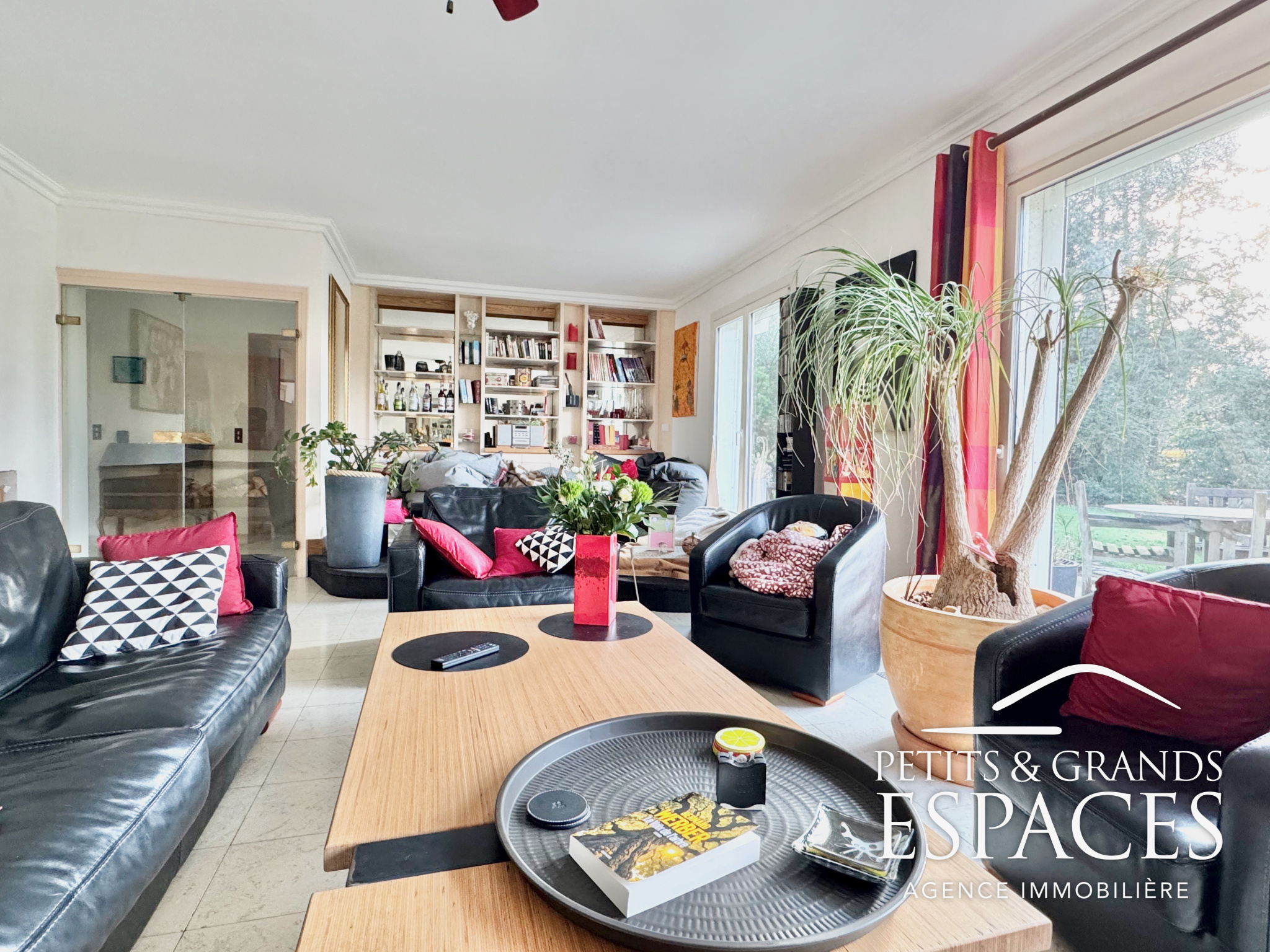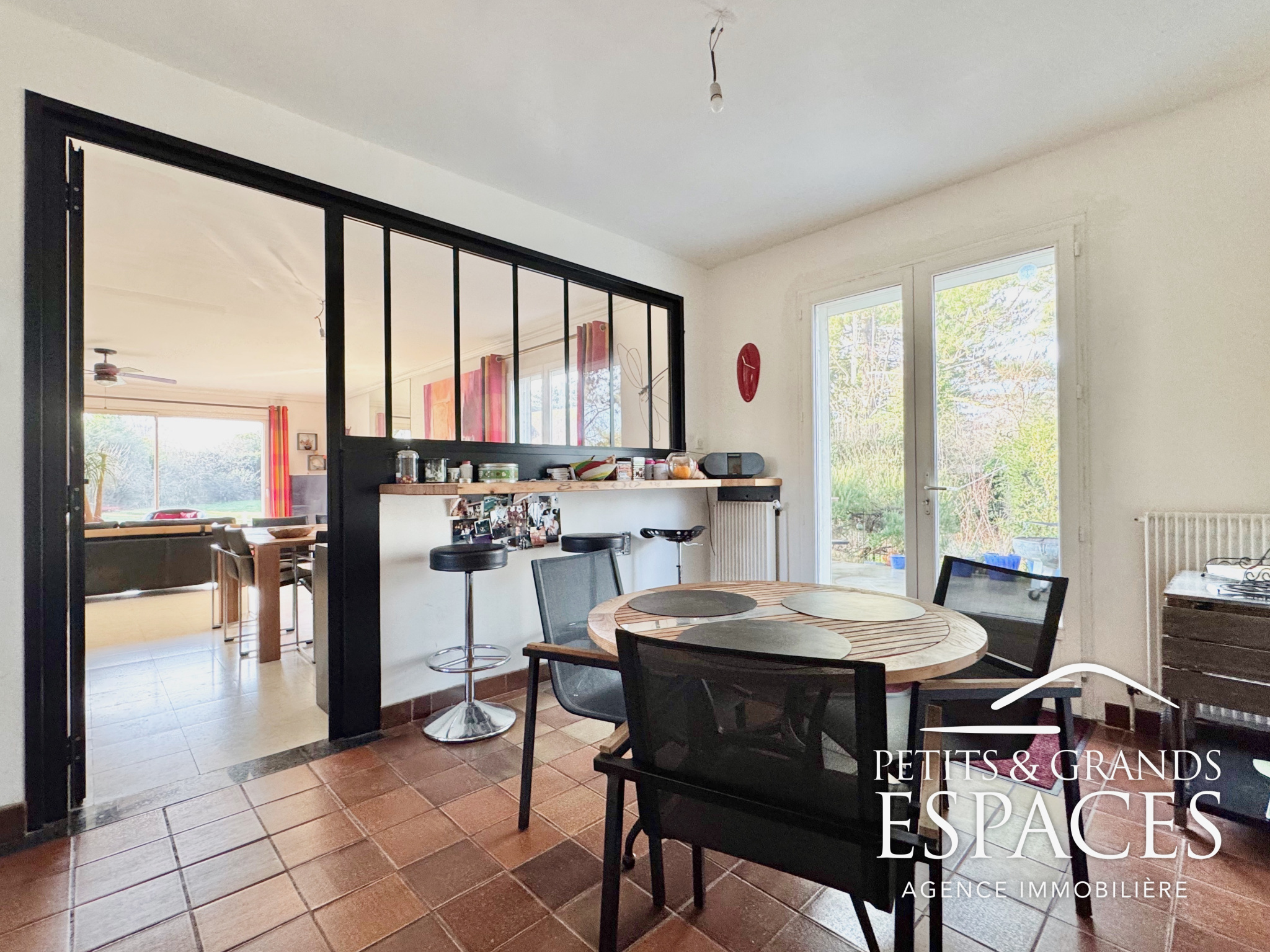 De larges ouvertures donnent accès à la terrasse et au jardin, assurant une belle luminosité tout au long de la journée.